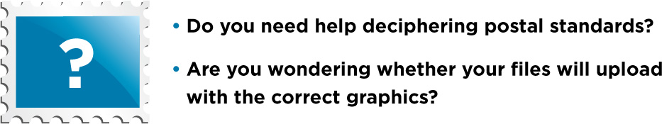 Our ultimate goal is sending your direct mail in the most powerful form possible. So if you don't find an answer to the right, please get in touch with one of our extraordinarily helpful Project Managers. We're here to help.