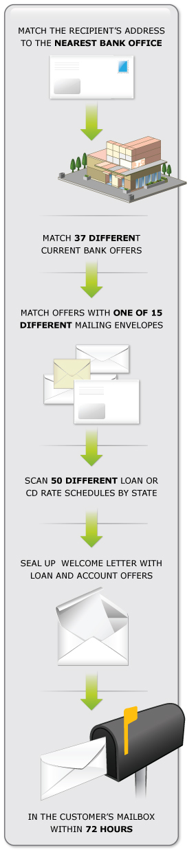 We needed to personalize each letter by matching the recipient's address to the nearest bank office. Then we needed to take 37 different current bank offers and match the right offers to the recipient's needs, depending on the account type, balance and demographics. Then we needed to match the right offers with one of 15 different mailing envelopes, scan 50 different loan or CD rate schedules by state, select the right rates in effect that week for the right loans and accounts, seal up the perfect welcome letter with loan/account offers in the correct envelope and have the bank's greeting in the customer's mailbox within 72 hours. Is your head spinning yet?